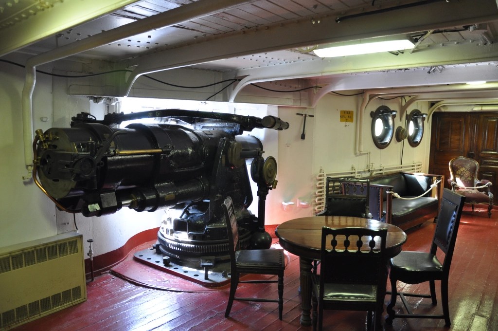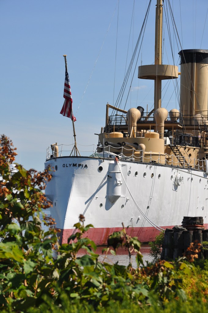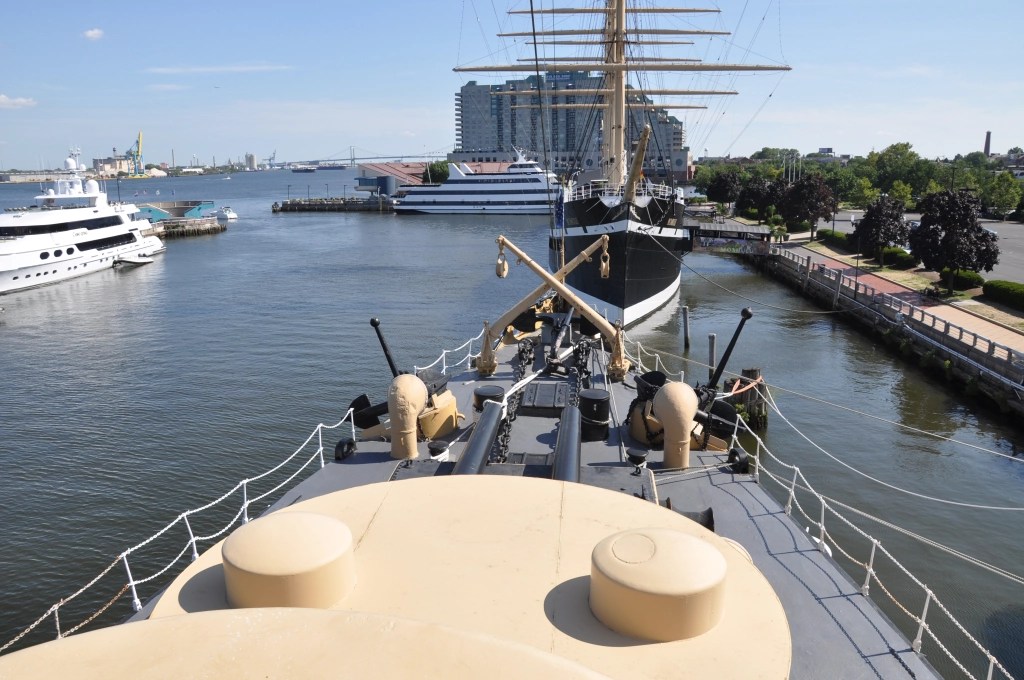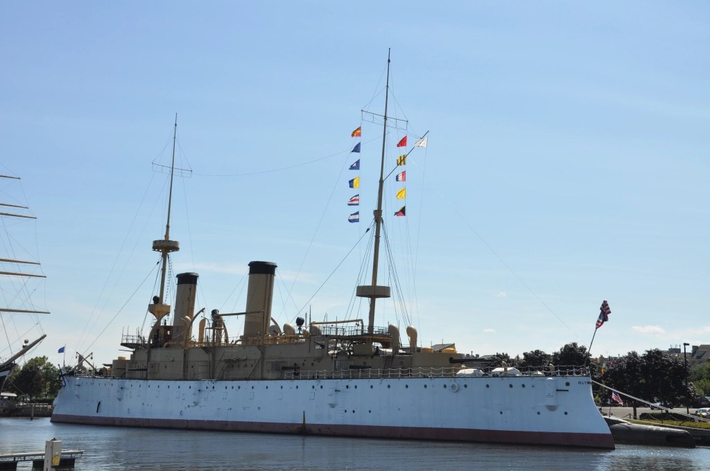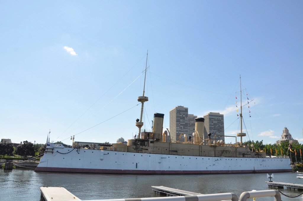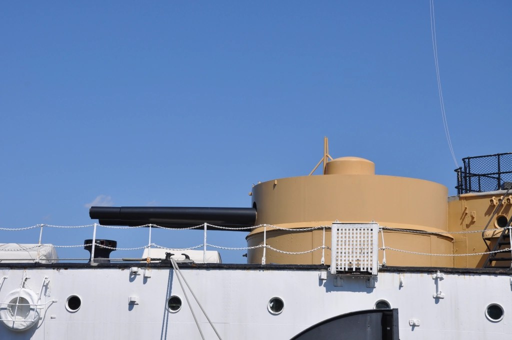 和新泽西停泊在一起的,有一艘貌不惊人的铁甲舰。其历史却不容小觑 – 当年美帝海权方兴,和日落帝国西班牙争夺菲律宾时,此舰作为杜威的旗舰立下汉马功勋。以至于后来显赫一时的大白舰队,只留下了这形单影只的一艘,其余都送去回炉了。装甲巡洋舰在当时因速射炮而正值大放异彩,甚至有认为对马海战起决定因素的正式八艘装巡。