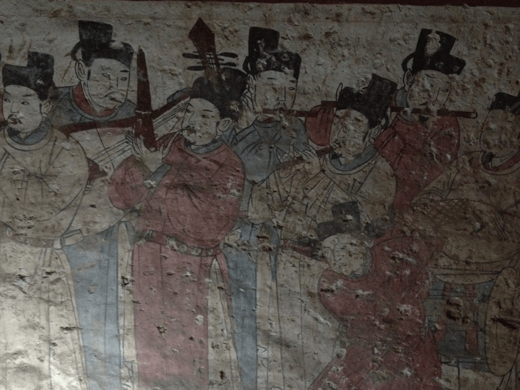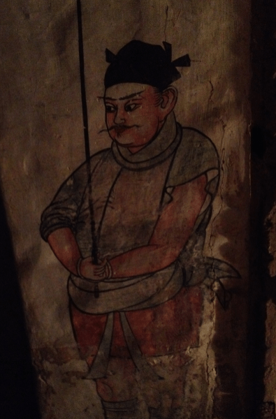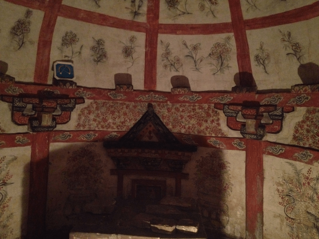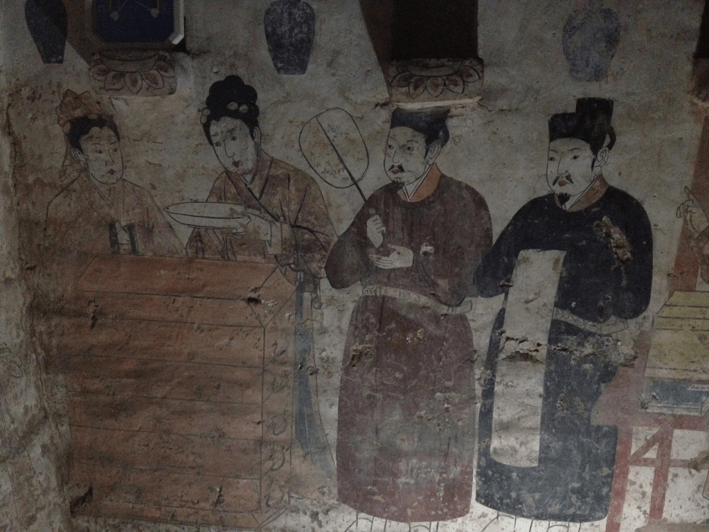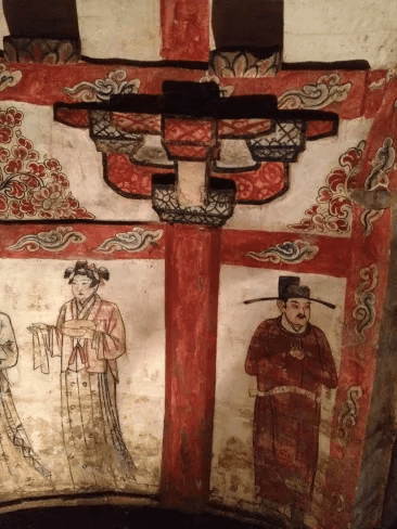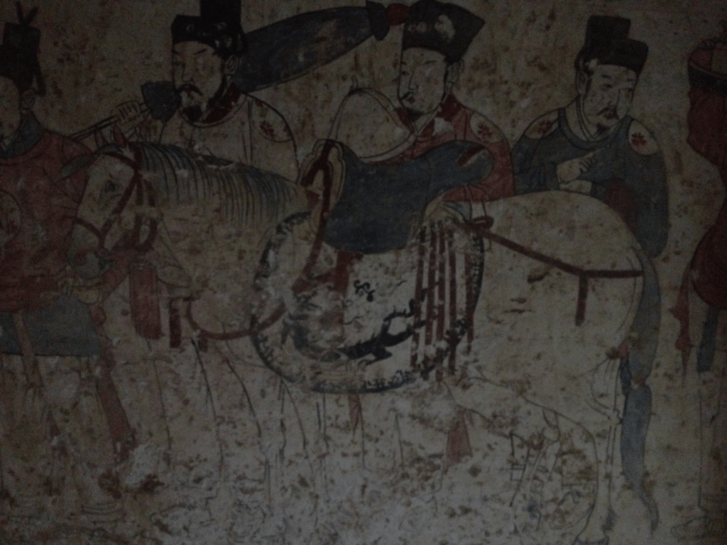 地面上不剩什么,只能去地下探索。根据杂志的介绍,继续前往宣化城外下八里乡辽墓。在这个人烟稀少,到处堆满垃圾,破旧不堪的典型新中国村落里,遍布多处辽墓群。目前开放的是辽张世卿家族墓群,以精致的工笔画闻名于世。看门老妪收取我们两人共一百元门票费后(有发票凭证),便掏出钥匙带我们来到墓室内。
