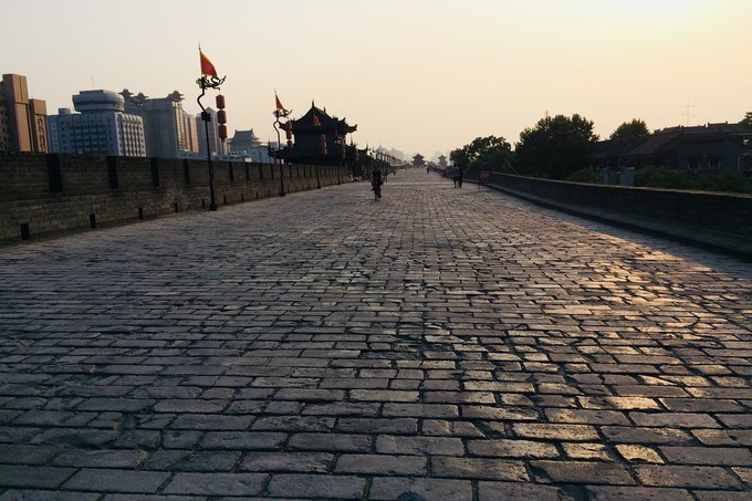 掸去一身的尘土,开车回到了西安。登上明城墙时,已是看黄昏景象。可惜城墙内外凭空多了许多楼厦,仿佛曲调外的杂音,干扰听众的赏析。不仅如此,城墙无处不在的红旗、灯笼等土不啦叽的装饰,也来添加一份聒噪。只能逆光远眺,朦胧中还有些许氛围。