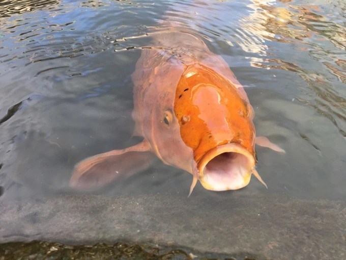 池塘中饲养者乌黑的纯色鲤鱼。鲤鱼争抢食物时头会探出水面,硕大的黑色身躯、两个触须,很容易让人联想到妖怪。中日民间传说都不乏鲤鱼成精。