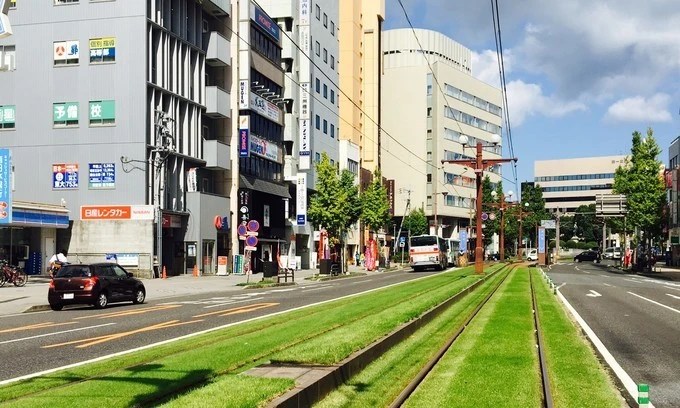 一到这里,便感觉到南国气息。这里温度比福冈高十度以上,气候晴朗。城市的有轨电车道用绿草铺垫,特别应景。
