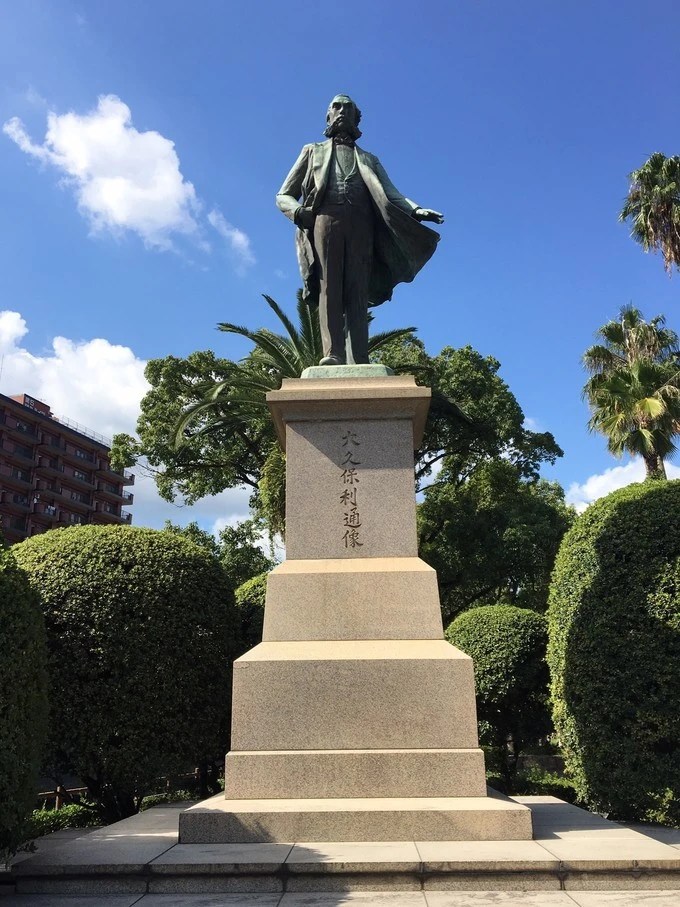下一站是城山展望台。城山是鹿儿岛市的一座山丘,山脚下是当时萨摩藩主的鹤丸城遗址。从河边到城山一路上开国元勋众雕像林立。