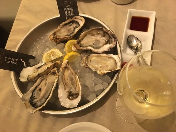 在福冈JR站商场顶楼的Oyster Bar。店里只卖本土生蚝,主要是北海道和长崎的品种。虽然和世界著名品种相比口感偏淡而单一,但饭店很专业。酒单上有Chablis令我很满意。Mum香槟可以按杯卖。