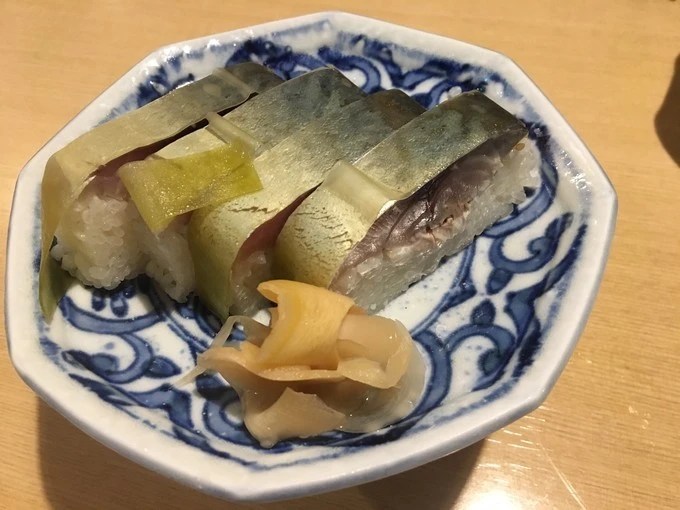 醋青花鱼刺身是一种比较原始的刺身品种,在很多寿司店都有。这种寿司通常做得很大,嘴巴小的人可以切开吃。醋青鱼的皮很特殊,好像啫喱一样薄薄一层。鱼肉的酸味和米饭的甜味混合在一起,有种特别的味道。