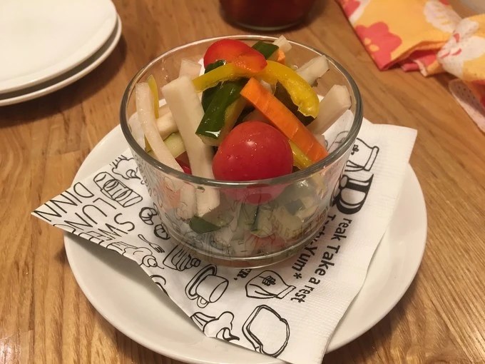 这个四川泡菜做得值得表扬。内容丰富,有红白萝卜、黄瓜、彩椒、小番茄。腌制的时间应该较短,蔬菜陡带着自己的口感和爽脆,并没有被醋味和花椒所埋没。