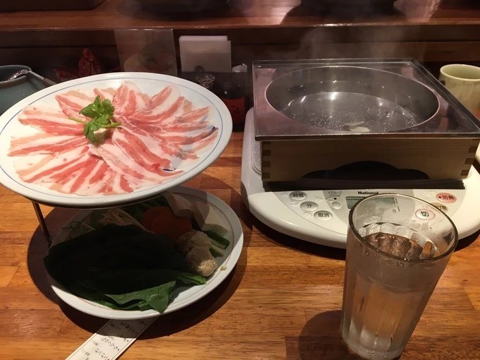终于吃到了鹿儿岛的特产萨摩黑豚,而且是最地道的shabu shabu吃法。猪五花切薄片,放在开水中刷几秒钟,吃起来又香又脆,确实比普通猪肉更筋斗。配上一杯萨摩烧酒嗨棒!