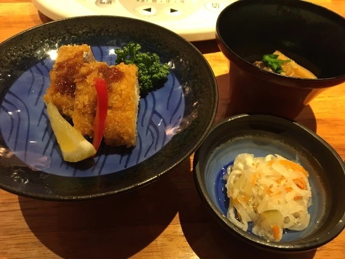 套餐配料丰富的蔬菜。还有许多小菜,包括炸猪排小点。猪排选用带厚油边的部位,咬下去满嘴油脂。因为是小点,所以并不腻,恰到好处。