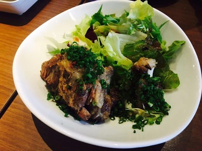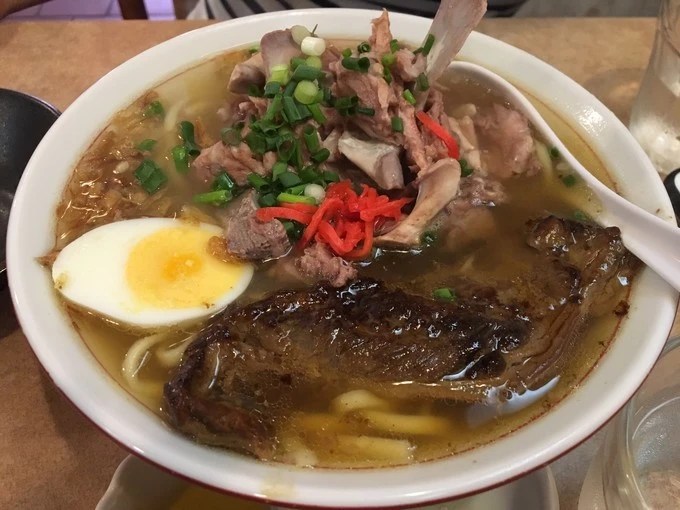 冲绳距离鹿儿岛并不远,因此这里有不少冲绳拉面馆。拉面中的照烧猪肉好大块吃着很过瘾。这还不算,还配有炖烂的猪骨头啃。