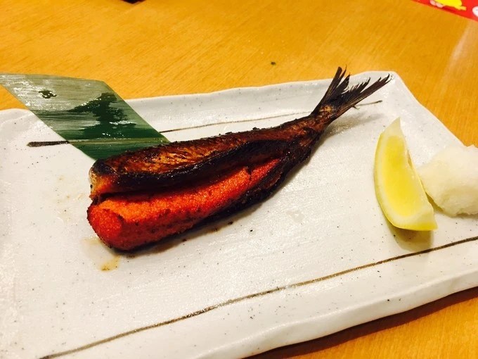 明太子本是福冈的特产,却在长崎吃了。这种当地流行的吃法,将鱼子放在一种类似小青鱼的肚子里一起烤吃。明太子还有很多吃法,属外焦内生的刺身最好吃。