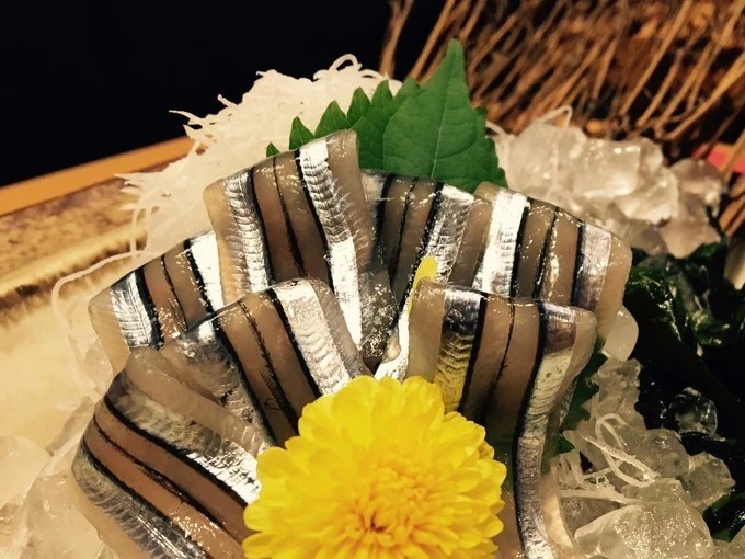 鹿儿岛位于日本本土四岛最南,锦江湾里有许多暖热洋流的特产,比如这种银色手指大小的小鲱鱼。鲱鱼刺身吃在嘴里有点像太湖银鱼,肉软骨脆。沾的是当地一种黄色的甜酱。