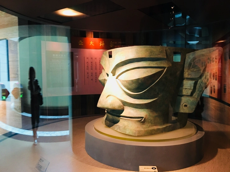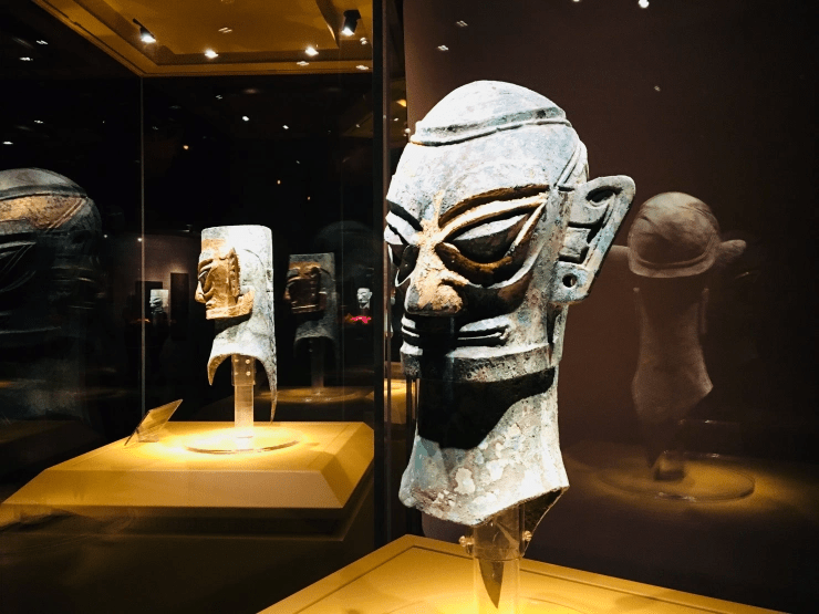 青铜头像商覆盖的黄金面具是精华所在。顿生一丝疑惑:据说古代的青铜器,在当时都是黄铜,只因埋于地下日久生蚀因而变成青色。如果三星堆的铜人头当时也是金黄色,那戴着黄金面具又如何看得出来?