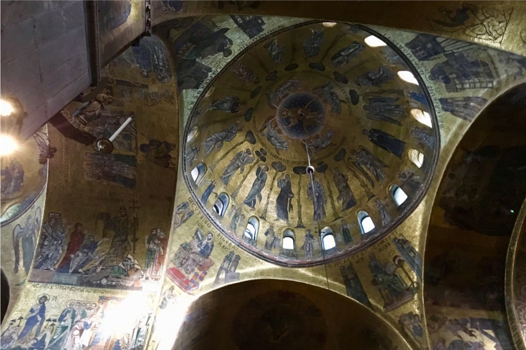 圣马可大教堂内原是不准拍摄的,却还是忍不住明知故犯,想来甚是惭愧。受拜占庭的影响,威尼斯艺人多有将绘画视为素描,将马赛克视为绘画,以为追求色彩极致的富丽。由此,硕大的教堂内,无数的穹顶、柱墙,皆用金底马赛克镶嵌。至于绘画的内容,威尼斯人似乎并不十分在意,满足于拜占庭-中世纪的会意标准。