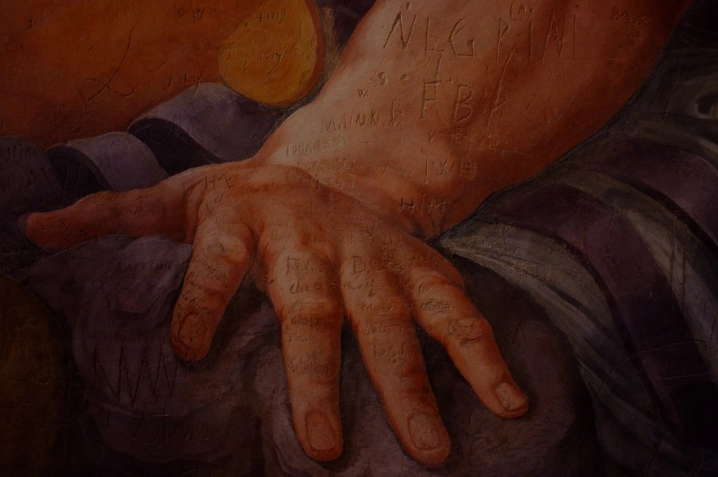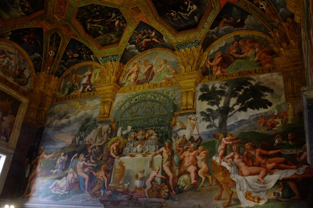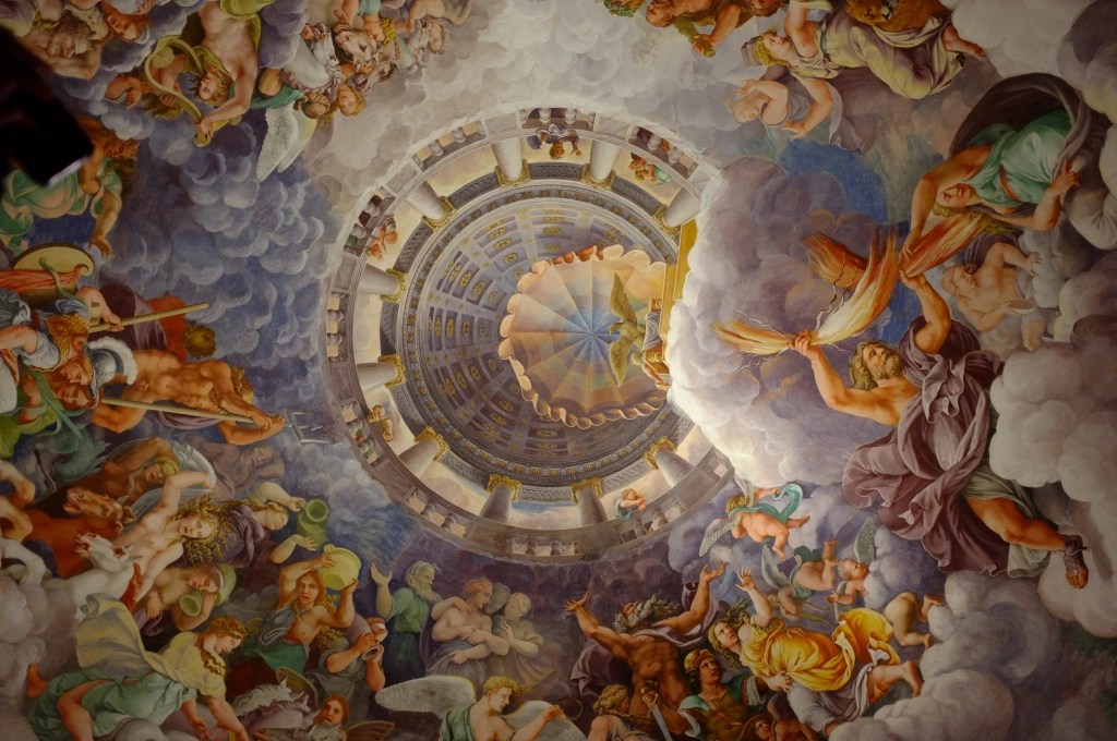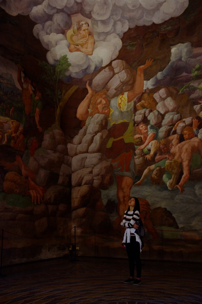 若非亲眼所看,无法感触罗曼尼巨作《泰坦之战》的震撼。画作覆盖一整个房间,从天顶一直画到墙角。位于双方的是宙斯等一众天神奋起抵抗,墙面上是泰坦巨人们在做狼狈的招架。整幅画一气呵成,沉浸之感觉相比置身于环球影院更有过之。如此巨作,却不见他人参观。在屋中端详三十分钟有余,除一行两人外,只有一位管理者静坐于旁。
