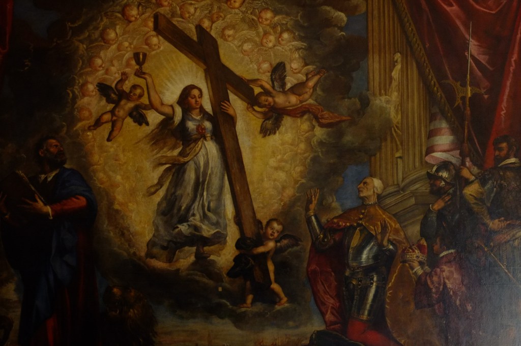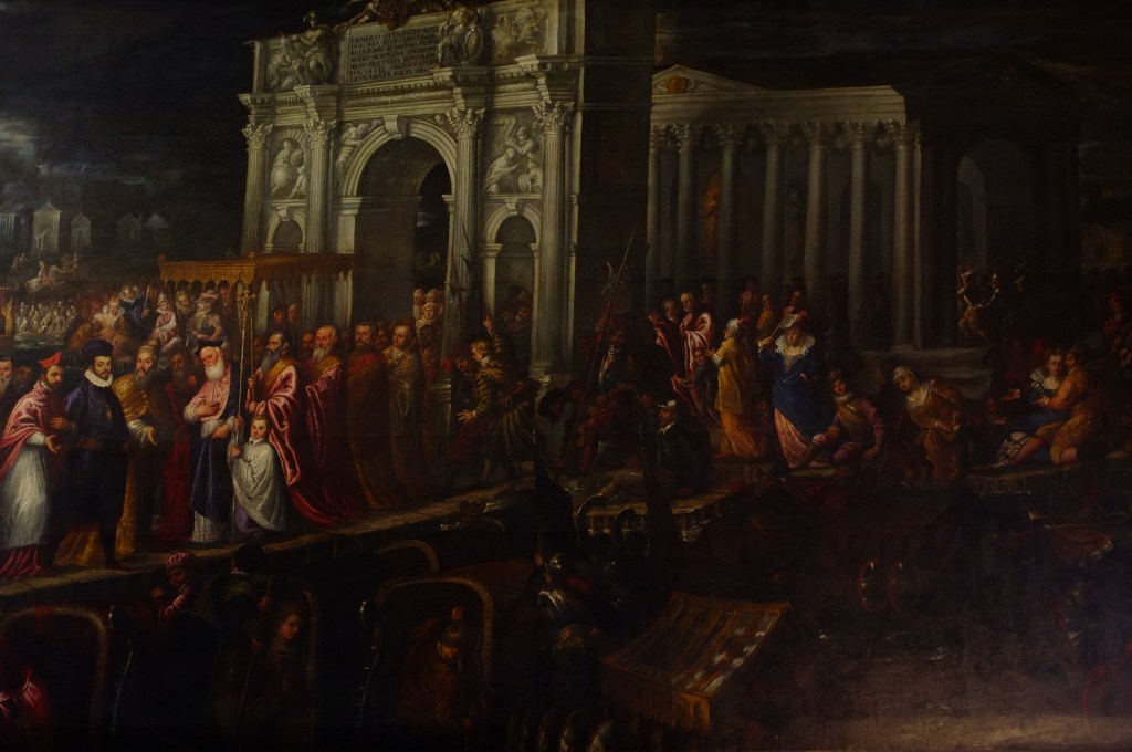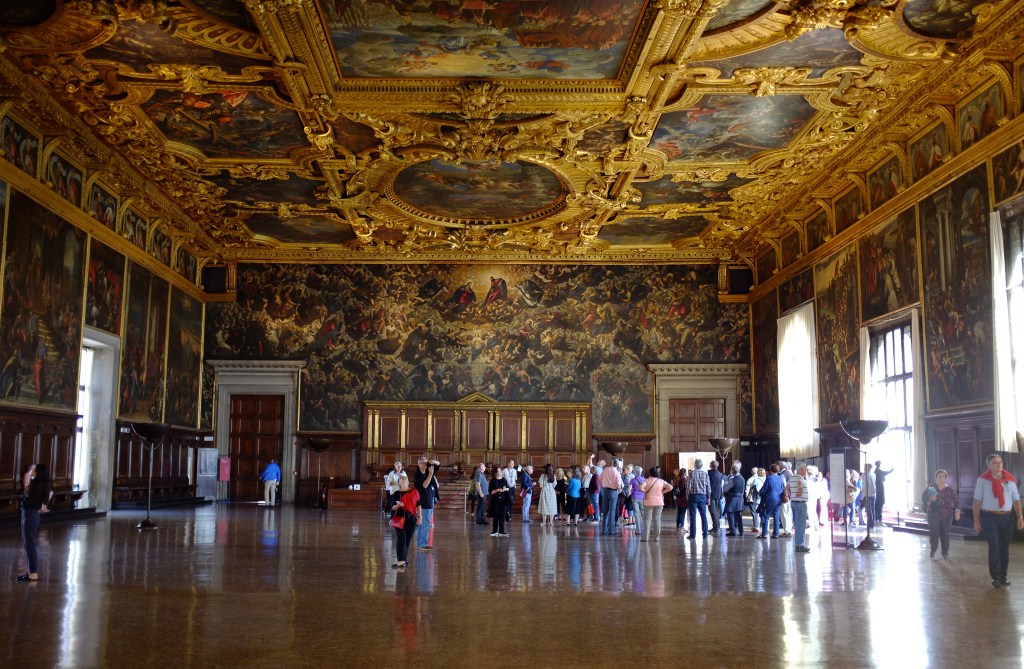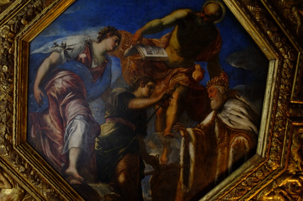十六世纪下半页,威尼斯军政、文艺皆逢盛世,富丽堂皇的总督宫,自然不缺创作题材和表现手法。于是乎,提香、韦罗内塞,丁托列托,以及后辈帕尔马,将督府作为战场,力求技压群雄,创作出一幅幅美伦没换的杰作。