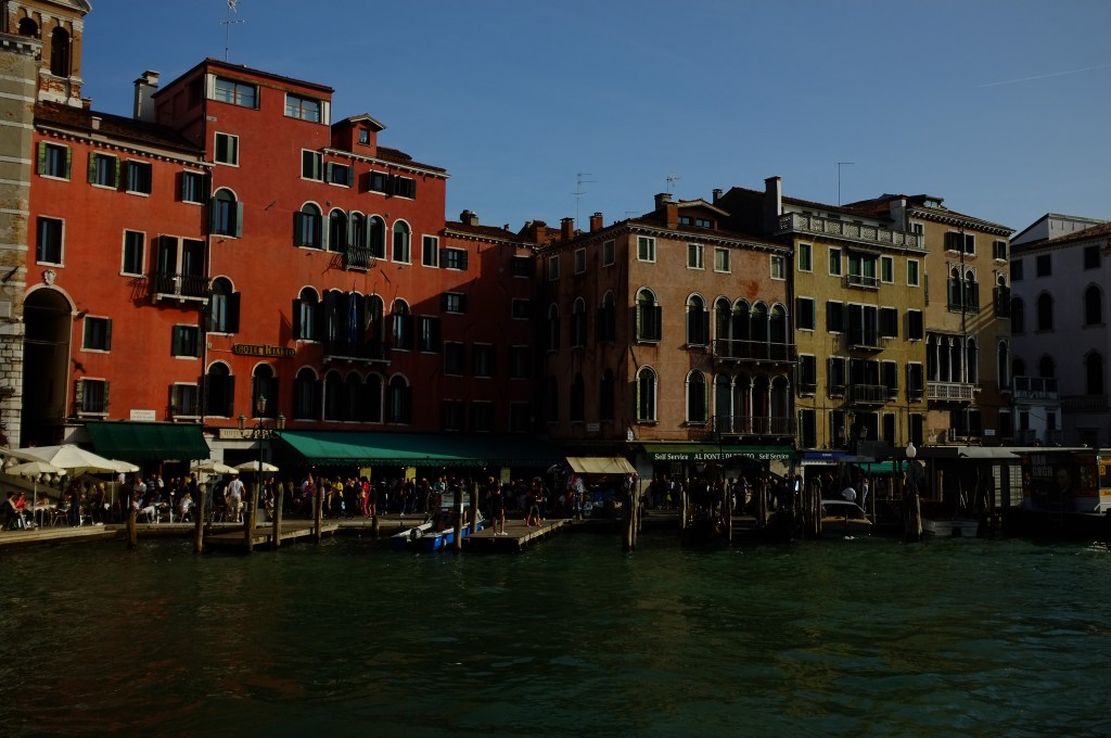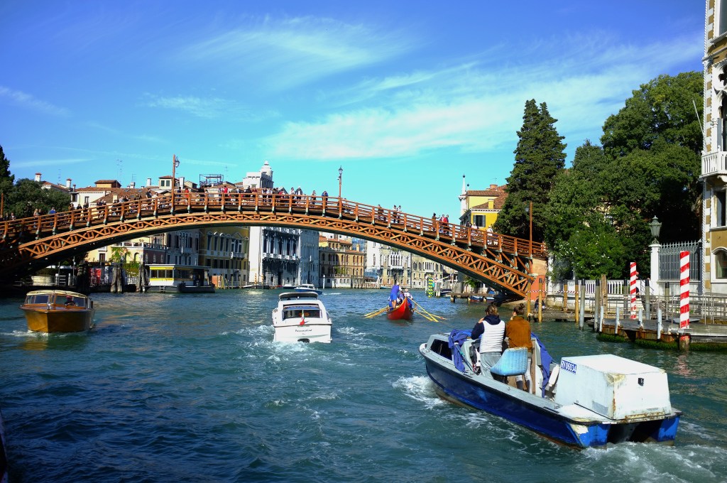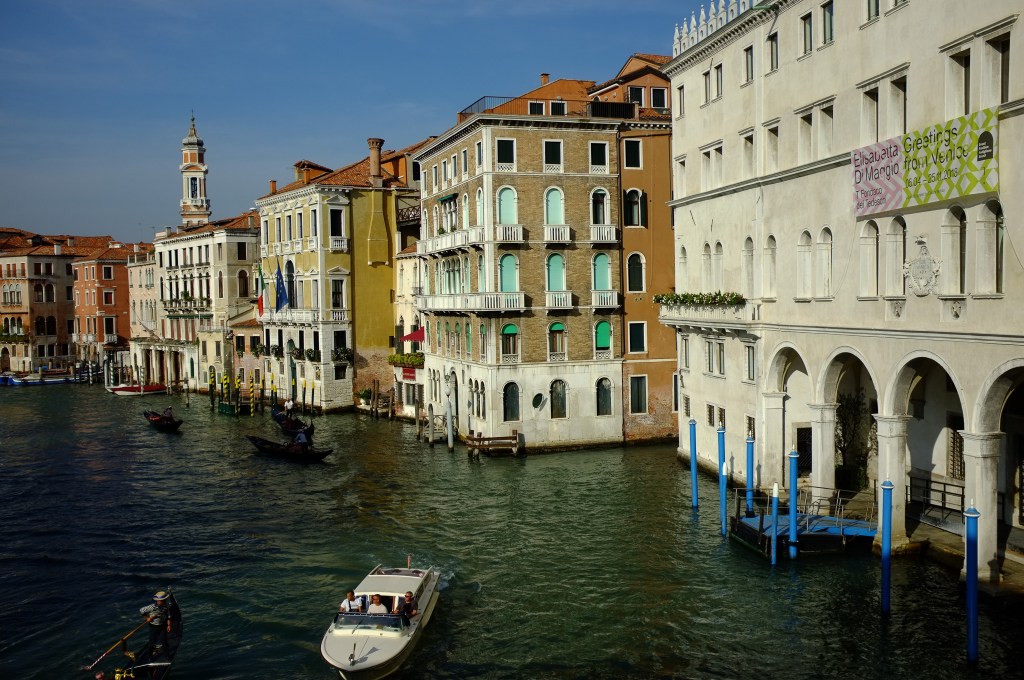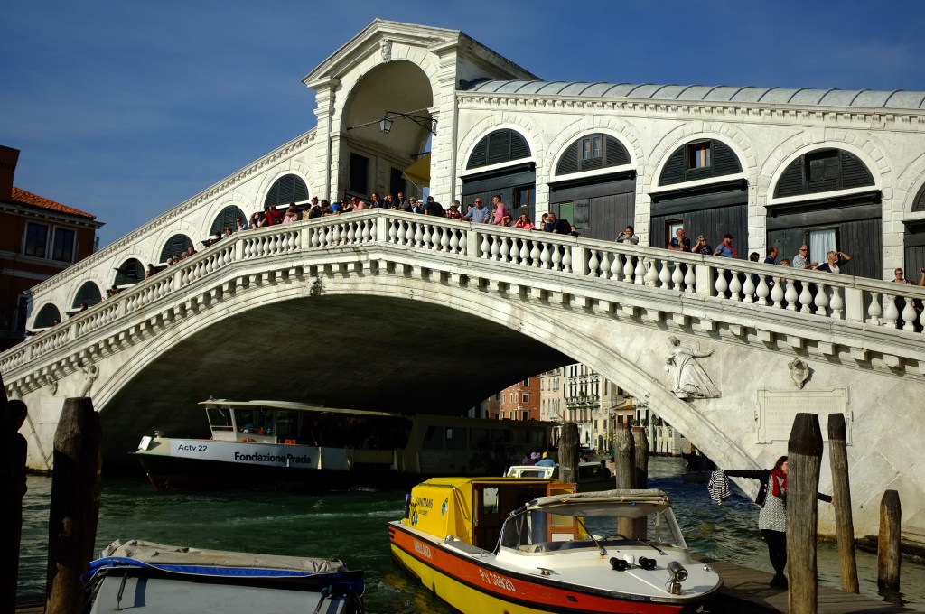威尼斯的十分美,圣马可广场占七分,甚于这三分中的大多,就散布在大运河两岸了。所谓大运河,是将威尼斯本岛按太极图般划分成两部的水上干道。又运河分叉出去的小河道,则犹如街道般构建起成个城市的交通网络 –贡多拉船、水上巴士、水上的士、甚至水上货船、垃圾船、均穿梭于中。里奥拓桥(Pointe di Rialto)是大广场之外最热闹处。当年参加竞选该桥梁设计的艺人中,赫赫有米开朗基罗参照佛罗伦萨维琪奥廊桥的设计,不过最终威尼斯人选择了本土建筑师Pointe的设计。Pointe一名在意语中亦位“桥梁”之意,真有此巧合。