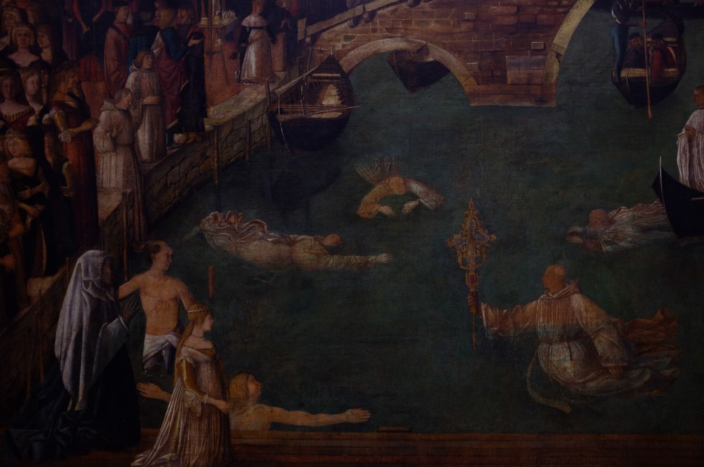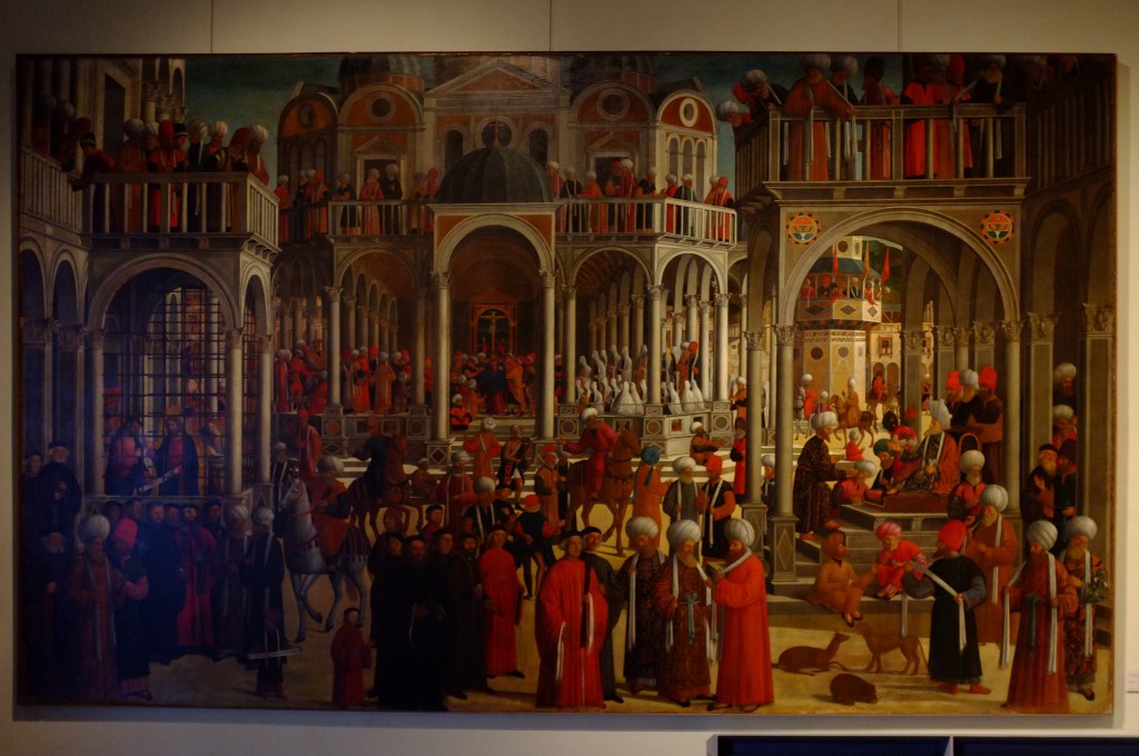 贝利尼家族是威尼斯画派的开山鼻祖,其画作开创鲜艳、世俗、热闹的特色。贝利尼家族两代三位画家,分别是老贝Jacopo,大贝Giovani,和小贝Gentile。在威尼斯最权威的学院美术馆,可以看到大贝和小贝的画作,其中大贝以人物肖像为多,而小贝由两幅巨幅情景画作。