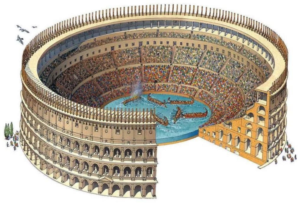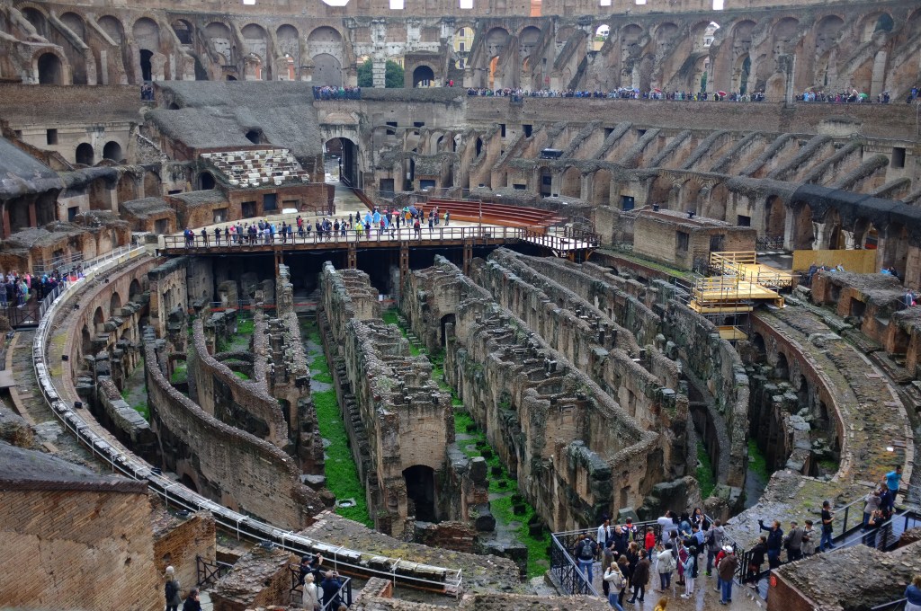 除了曾经主席台前方的场地被部分还原以外,整个建筑都保留着历史侵蚀的原样 – 和仍在使用的维罗纳“小竞技场”天壤之别。外墙上所有值钱之物都被卸走 – 如果不是因为曾在此处死过基督徒,而被教指定为圣迹,如今可能荡然无存了。最震撼的是地下部分 – 厚重的大理石墙壁分割出一个个竖井,不但可以容纳成千上万的奴隶和野兽,更可通过升降机关做出惟妙惟肖的舞台效果。而在竖井之上,整个赛场可以注水成湖,以供数十艘帆船表演海战,并一次性淹死上千人。
