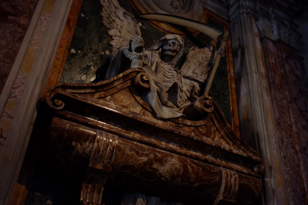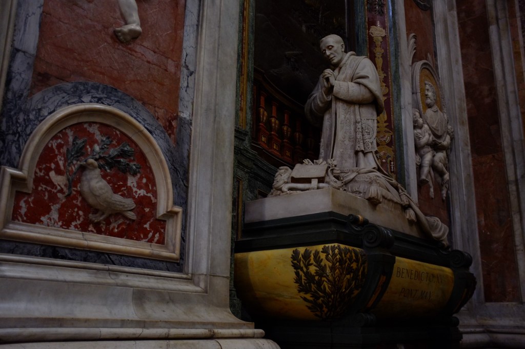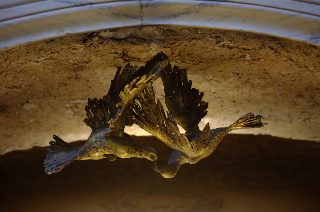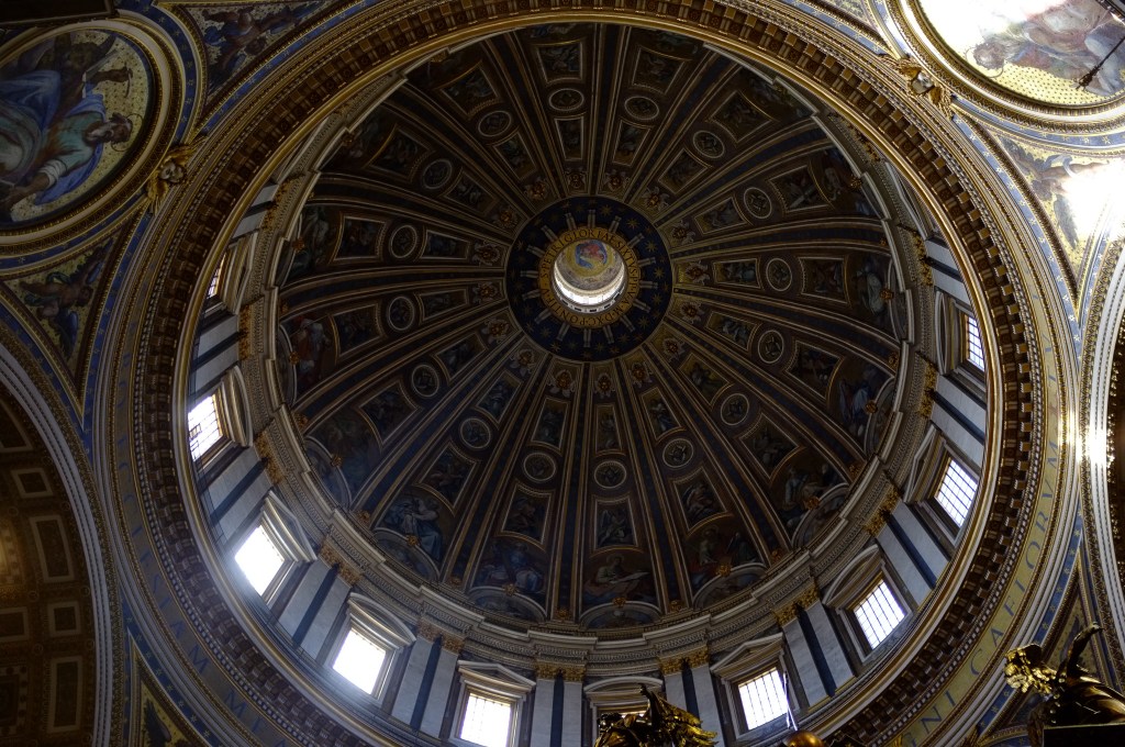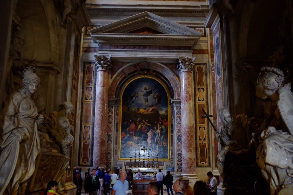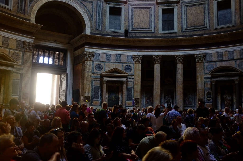 从内部观看拱顶,其中间有一个巨大的采光空洞,其上没有任何遮盖。据说即使亲盆大雨也丝毫不会渗入殿内 – 这时很盼望能像昨天似得来场大雨验证。殿堂内挤满游客,顺着人流慢慢蠕动,注意观看每个祭坛的精美装饰 – 最壮观的是埃曼纽尔二世之墓,但人气最高的则是画圣拉斐尔之墓。拉斐尔墓上没有壮观的雕塑,精美的装饰,却有两只真实尺寸的铜铸小鸟,呈飞翔状,活灵活现。