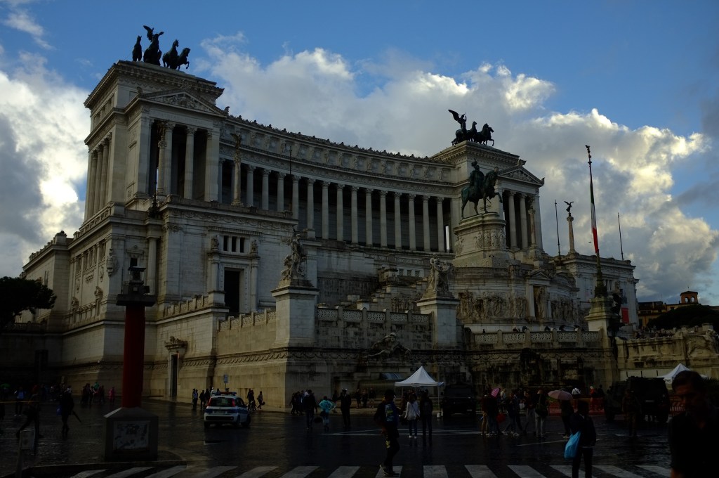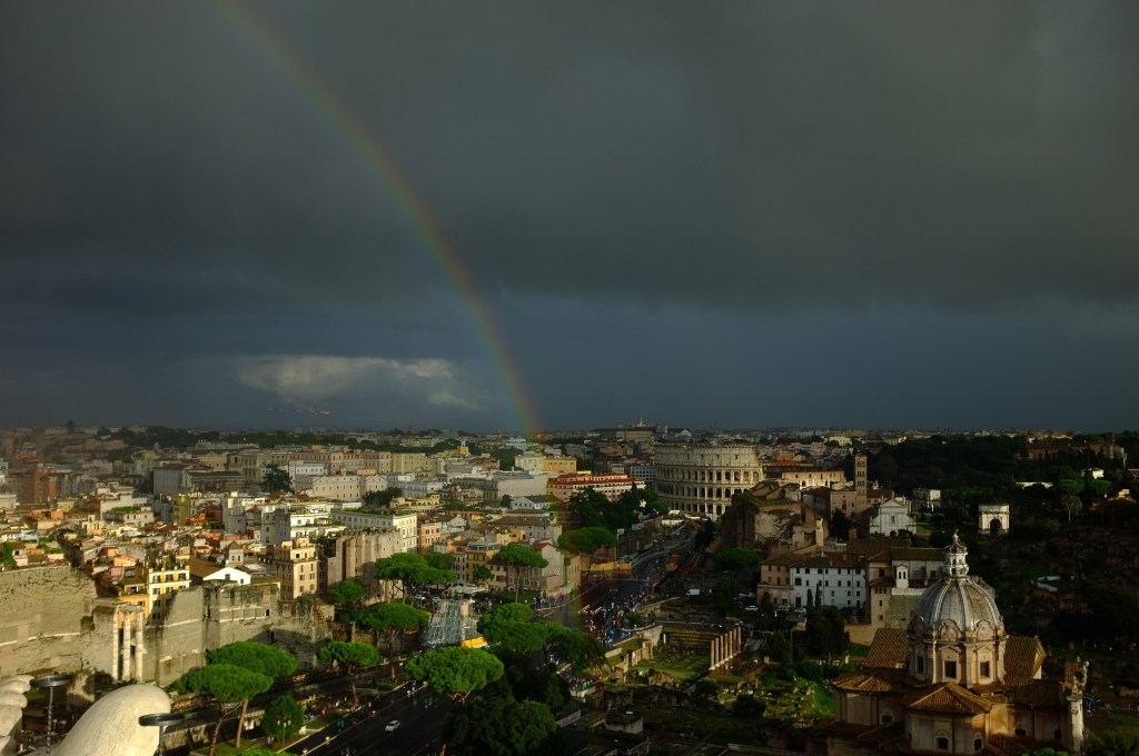 威尼斯广场的国家祭坛可能是世界上最大的纪念碑了,白色的身影坐落在醒目的高处,与周围低坑中的罗马遗迹形成鲜明的反差。来到祭坛,随意拾阶而上,竟有一部电梯可达顶部。在排队等电梯之时,眼见刚放晴的天空,远处乌云逼迫过来。不到几分钟,倾盆大雨顿降,无奈只好在楼顶仅有的遮蔽处和众多游客拥挤在一起。大雨落了约二十分钟后,刹那间乌云散开,彩虹浮现。见此佳景,也不枉费这一顿折腾了。