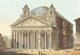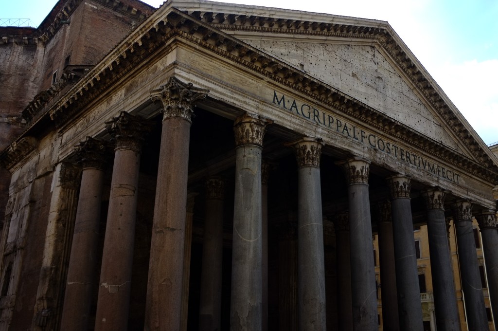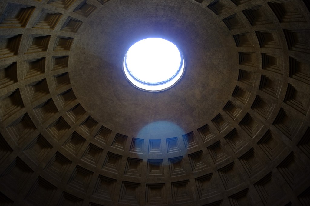 和Forum上众多希腊风格的罗马神庙不同,万神殿则破天荒地将主题改为一个圆形的大厅,并用火山灰混凝土技术加盖了一个拱顶。虽然受限于当时技术,拱顶外观低矮并不出众,但在一千数百年后,当布鲁内莱斯基为圣母百花大教堂封顶寻求方案时,还需从这里汲取灵感。