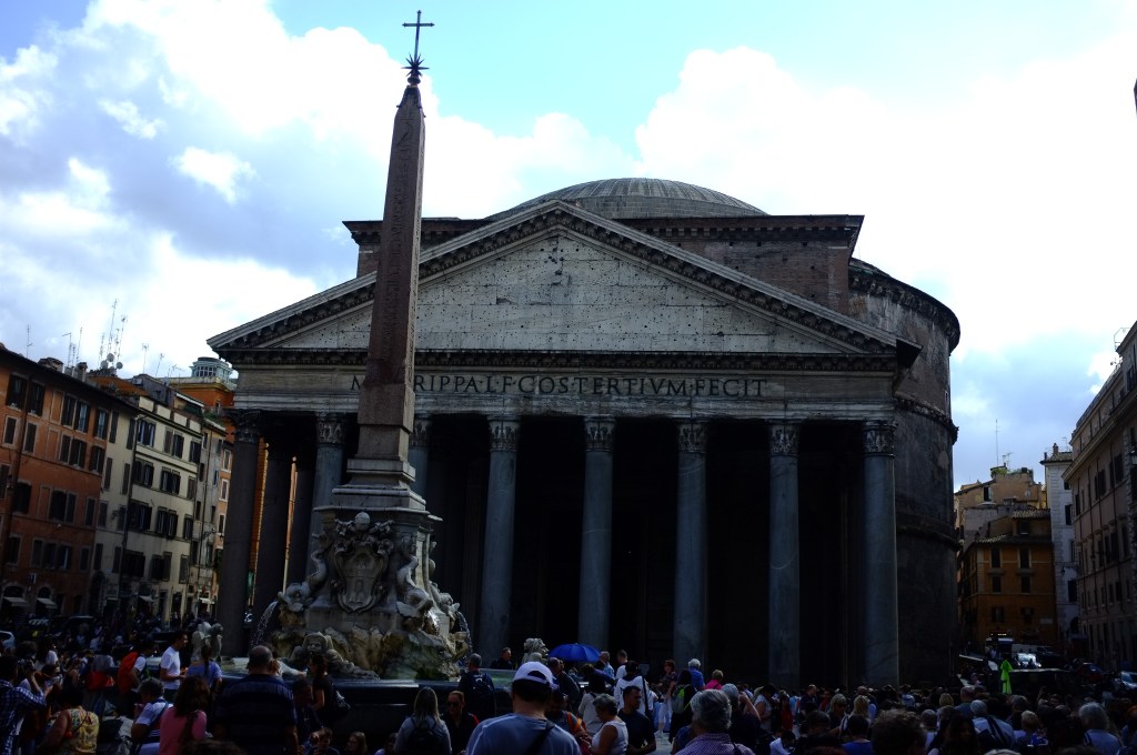 罗马的第二天,虽已晌晴白昼,却时不时飘过一阵急雨,抬头观望全然不见云雨踪迹。在家乐福匆匆买了点心垫饥以后便赶往万神殿。公交车上空气闷热,倒也正好借着堵车稍事休息一阵。