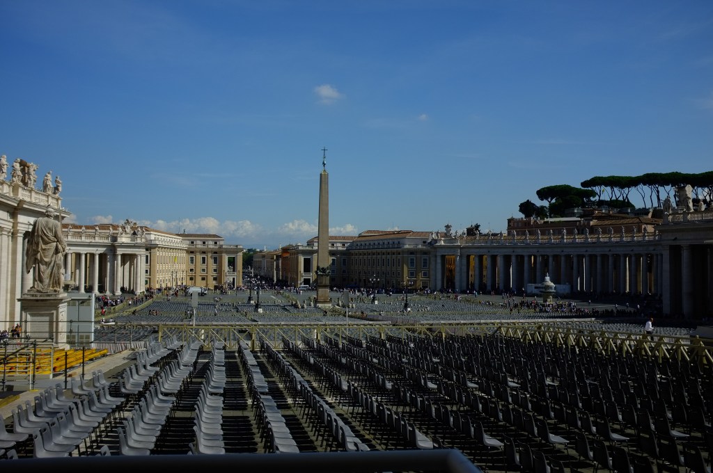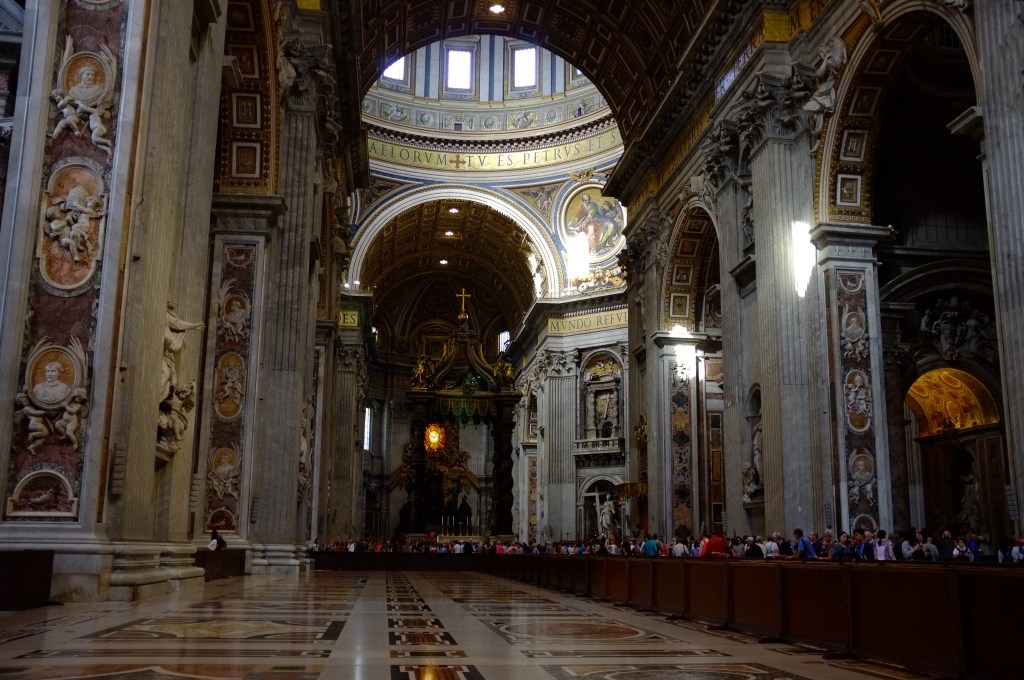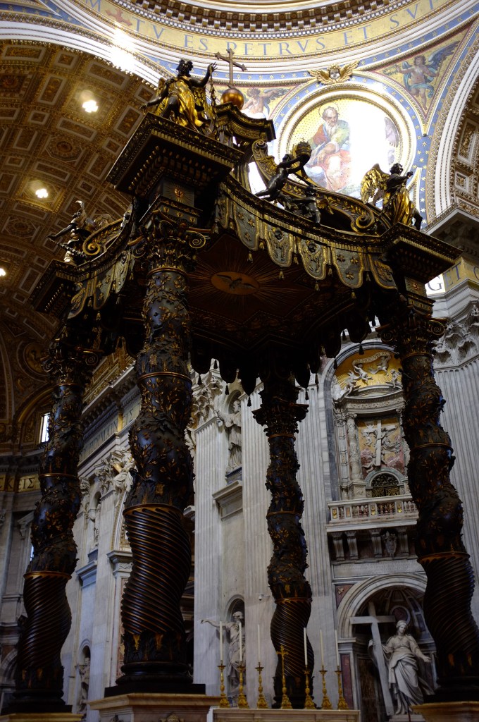 梵蒂冈与罗马市中心隔台伯河相望,原是君士坦丁大帝修建的圣彼得大教堂所在,建造于圣彼得埋葬处之上。教宗里奥三世曾邀请查理曼大帝于此并为其加冕。旧堂屹立一千年之后,教宗儒略二世将其推倒重建,经过一百二十年的修建,遂有眼下这座世界最大圣殿的奇观。新堂主体由米开朗基罗设计,而之后贝利尼设计的大回廊为期画龙点睛。