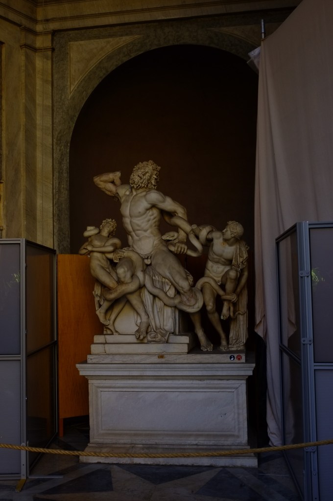 雕塑中的镇馆之宝是《拉奥孔》,据古罗马老普林尼记载为罗德岛雕塑家所作,描绘泄露天机的拉奥孔父子被雅典娜派来的毒蛇杀死的场景。雕塑被发现是拉奥孔右臂缺失,为将其补全而引起了一场争议。主流雕塑家认为其应该向上伸展,唯米开朗基罗坚持应向后弯曲。最后作为裁判的拉斐尔同意前者并按此修复。后来,遗失的手臂被发现,原来竟如米开朗基罗所说。