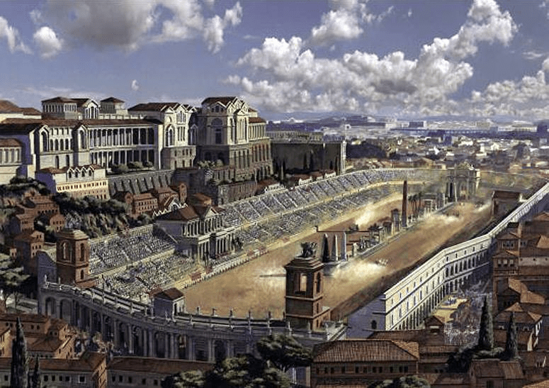 从宫殿上俯瞰Forum的另一边,曾是比大竞技场更壮观的大赛车场(Hipperdrome) – Circus Maxiums,如今只剩地基犹在。大竞技场可容纳五至八万名观众,而赛车场则是二十五万。