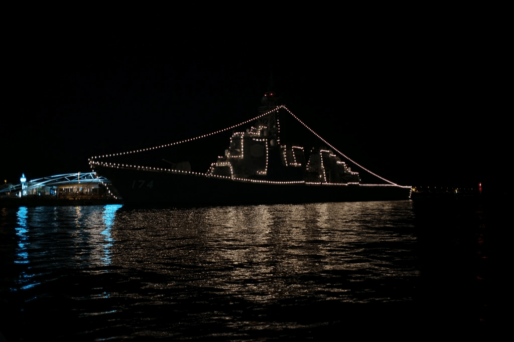 晚上坐渡轮归来时,军舰张灯结彩。这么帅气的军舰,开到哪里都像过节一般。