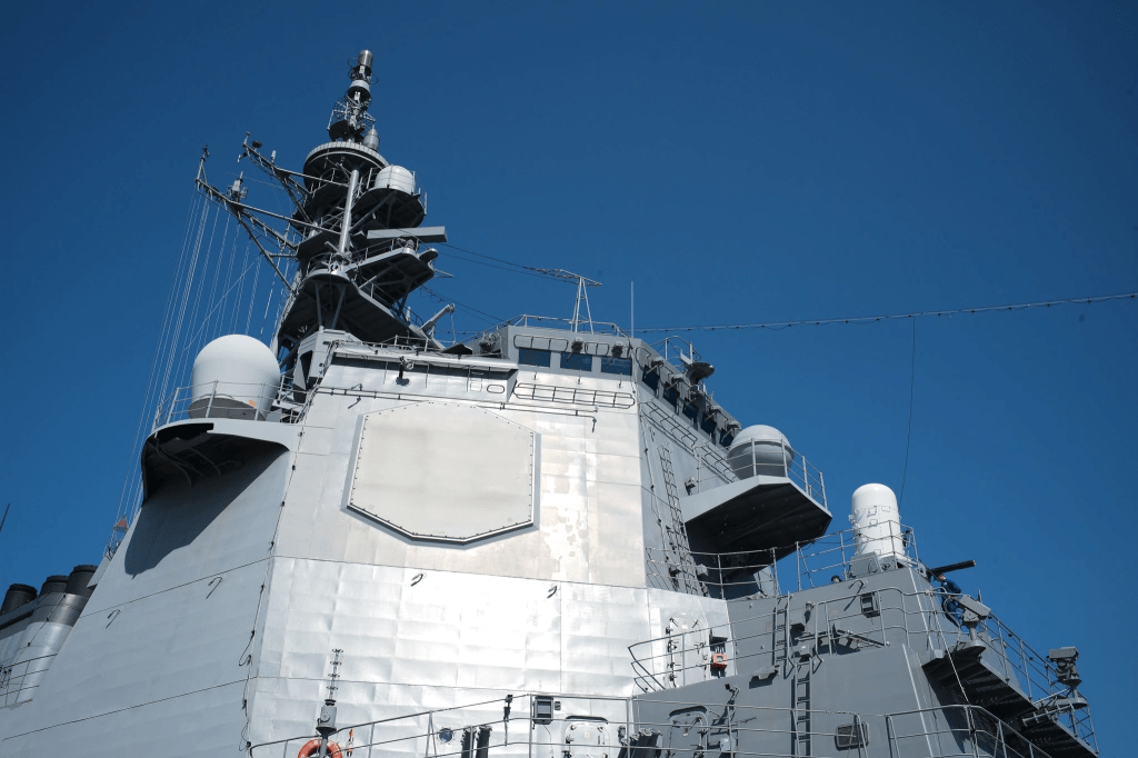 “雾岛”舰与美国亲戚最大的区别在于天线。缺少了横桅,戳在宙斯盾上头,有点像天线宝宝。