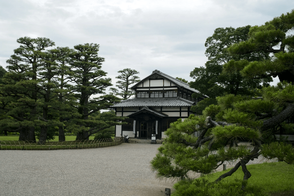 城堡的二至丸,江户时代被改建成披云阁,是典型的枯三水园林。园中河流用沙石模仿,充满禅意。