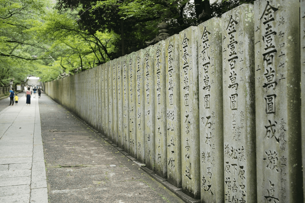 转过弯到了步行街,顿时热闹起来,沿途各色商铺林立,从山脚知道半山腰。其中还有鼎鼎大名的乌冬面学校。清汤寡水的一坨面,加一个饭团、一个豆腐包、一块天妇罗、一块关东煮萝卜,竟然吃得直打饱嗝。惭愧啊!上半段山路,密密麻麻全是记录捐赠的纪念柱。换算一下,树一块石柱约需人民币五至十万元。