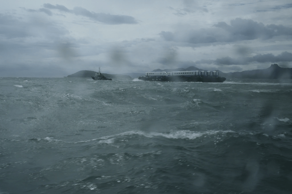 日本的快艇真是猛烈,惊涛骇浪中穿梭与岛屿和往来船只之间,几乎是行驶于风口浪尖。在往来的船只中,还看见一艘运载火车车厢的拖船。这么大的风浪,不怕车厢掉海丽吗?