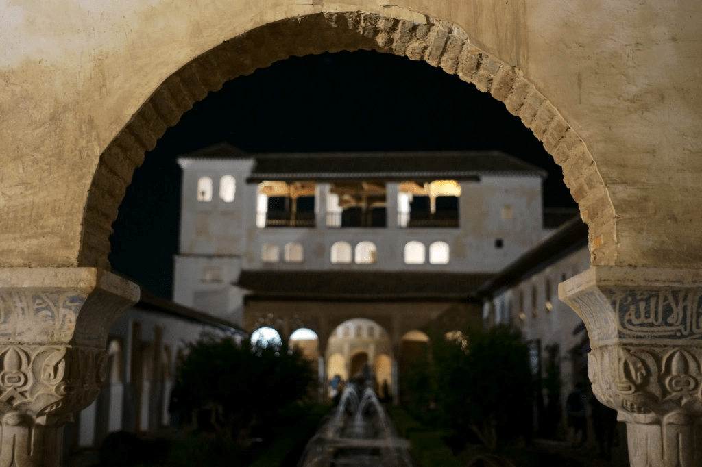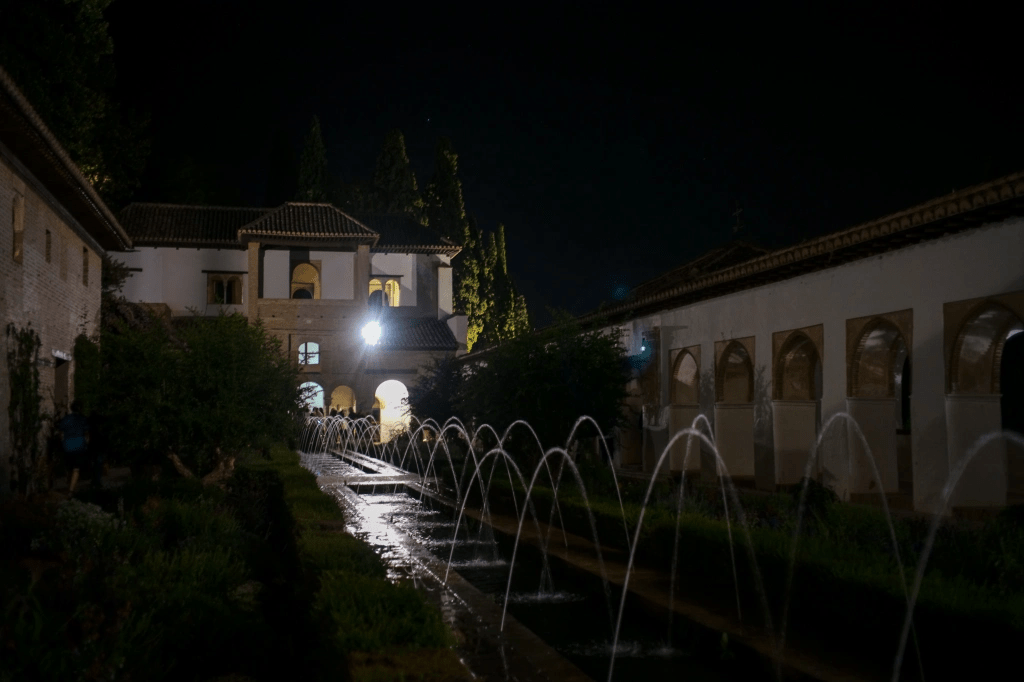 在伊斯兰帝国四分五裂,摩尔统治即将告终之时,格林纳达的Nasrid王朝却玩起了最后的疯狂 – 修建了欧洲独一无二的伊斯兰综合宫殿群 – 阿罕布拉宫。宫殿位于足可俯瞰城市全貌的山坡上,周围有坚固的城墙和塔楼,其下是人工凿刻的峭壁,隔山相望,气势非凡。要想近看却不容易,本已驱车到达想直接入内,却被告知三日内的参观门票均已售磬,而最精华的狮子院和石榴院(需另外购票)则已预约到三个月外。不幸中的万幸,高价从旅行代理买到了夜间导览参观的门票,终不负管豹一窥。