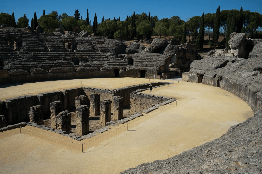 Italica的角斗场位于城门外,其规模足够容纳两万五千人(甚至远远超过Italica本身人口),保留也很完好,虽然不足媲美罗马城的Colosseo(容纳超过六万人),除此之外在帝国内也找不到更大的了。