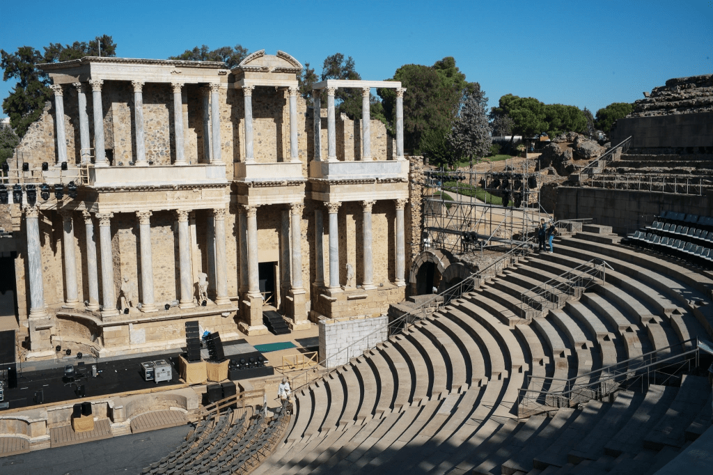 除了被当作文物保护起来的废墟,Italica的扇形露天剧院确实至今仍在使用的。虽然没能看到,几天后在其以北约二百公里处的Merida却见到了帝国疆域内最为著名的,同样仍开放使用的扇形露天剧院。由于剧院以半圆形最适合观众欣赏,罗马人在设计是很注意与周遭环境的集合。或面向大海,或群山屏绕。Merida的剧院,以高耸的罗马柱墙为舞台背景,独出心裁。