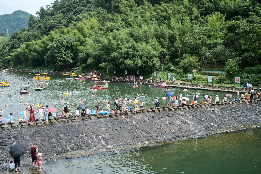 下午离钓台后,在卢茨村卢茨湾带孩童玩水,吃农家乐。卢茨村是一个坐落于富春江直流的小镇,因网红水坝而闻名。酷暑下,孩童在水中耍闹,大人则在岸边农家乐吃饭、喝茶、分西瓜,热闹非凡。此情此景,杜牧之有诗曰: