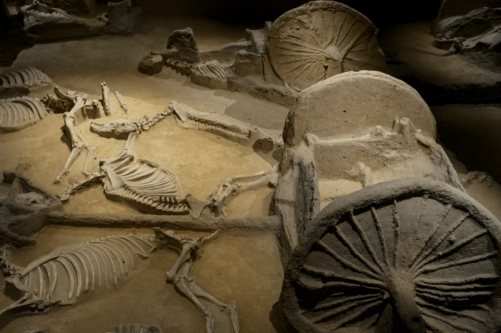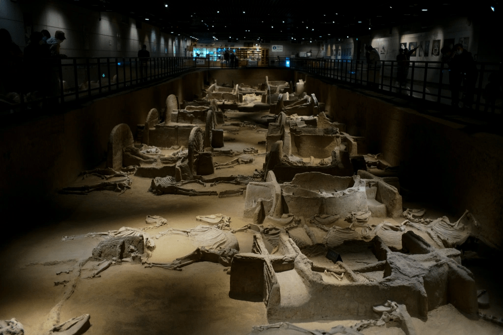 周天子时期的遗址不容易发现,洛阳却惊喜 – 在建于周朝陵区遗址的天子驾六博物馆中,出土了六马拉车的殉葬遗迹,按制度应是天子御用的,在全国也属仅见。至于如今的洛邑古城景点,虽位于周都遗址上方,其景致却属清、明,和当时没有太大关系了。
