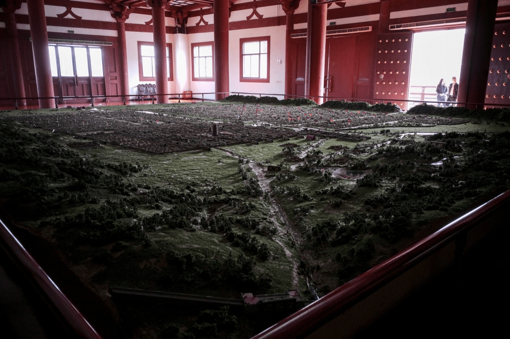 定鼎门城门楼内,铺满一副硕大的3D唐洛阳地理图。不但做工精细,更结合标注。这里是白少傅洛下卜居的著名豪宅,乐天在其中“形容逐日老,官秩随年高”。同一高档社区住的,还有裴度、元稹两位诗友。“二十三年折太多”的刘十九则住得很远,在天津桥西,洛水南岸。王右丞“万户伤心生野烟”时的凝碧池,则在城郭以西的高地上.洛水北岸,还有才子顾况红叶传情的上阳宫。还有姚相、宋相、狄相、太平公主、武三思、甚至薛怀义,众多风流人物的踪迹。