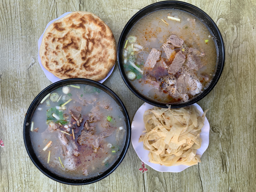 早餐大概是洛阳最热闹的一餐了,主题是喝汤。胡辣汤、牛肉汤、驴肉汤、不翻汤、琳琅满目。用来与汤搭配的主食有三种标配:圆滚滚的发面烤馍、长长条的死面烤饼、以及烤饼加工的饼丝。还有江泡面浸在汤里的,大概是近些年来研发的。