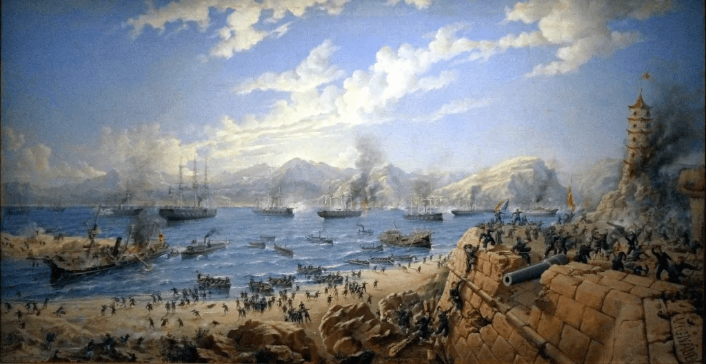 蒸腾铁甲,蒸汽铁甲舰也。霹雳蚱蜢,鱼雷艇也。是役法兰西海军曾用杆雷艇击沉福建水师战船。