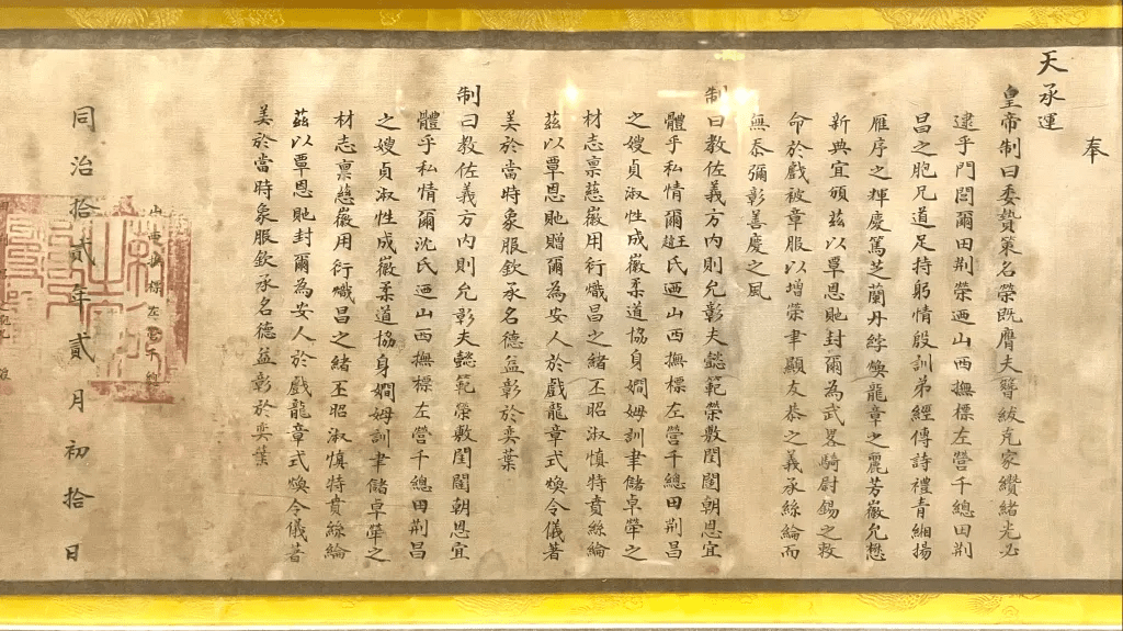 同治年间的制书。主人公田荆荣,因为胞弟 – 田荆昌,职务山西抚标左营千总,属从六品(相当于民兵营长),而受移封武畧骑尉,属正六品武散官(畧,通“略”)。“承丝纶而无忝,弥彰善庆之风”,又是套话。