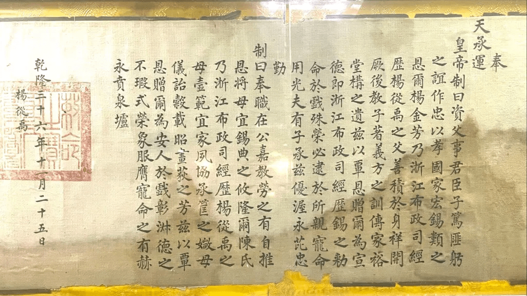 第三幅是乾隆年间的制书。乾隆年的制书纸张篇幅一样,文字却要大许多。这里恩赐的是杨金芳夫妇,儿子是浙江布政司经历,正六品。父亲赠宣德郎,母亲赠安人。看来要封赠都是赐一对的。既然用赠字,应当皆已去世。更何况文字中有永庇忠勤、永贲泉垆。