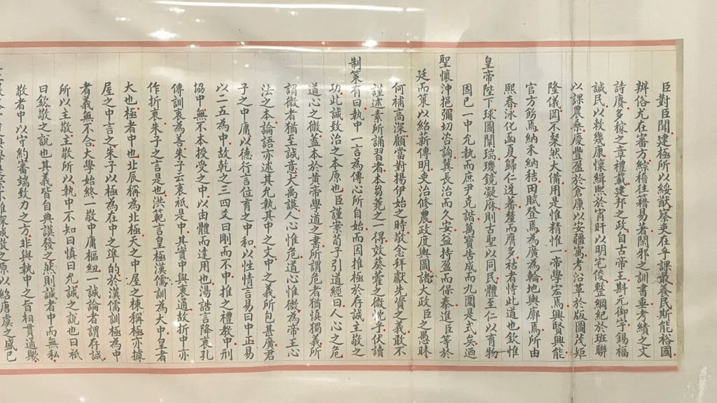 末代帝师陈宝琛的殿试卷子。殿试卷子是不糊名的,原文很长,只展开了一部分。尝试做了句逗。不知道试题是什么,答卷内容无外乎是中庸之说。
