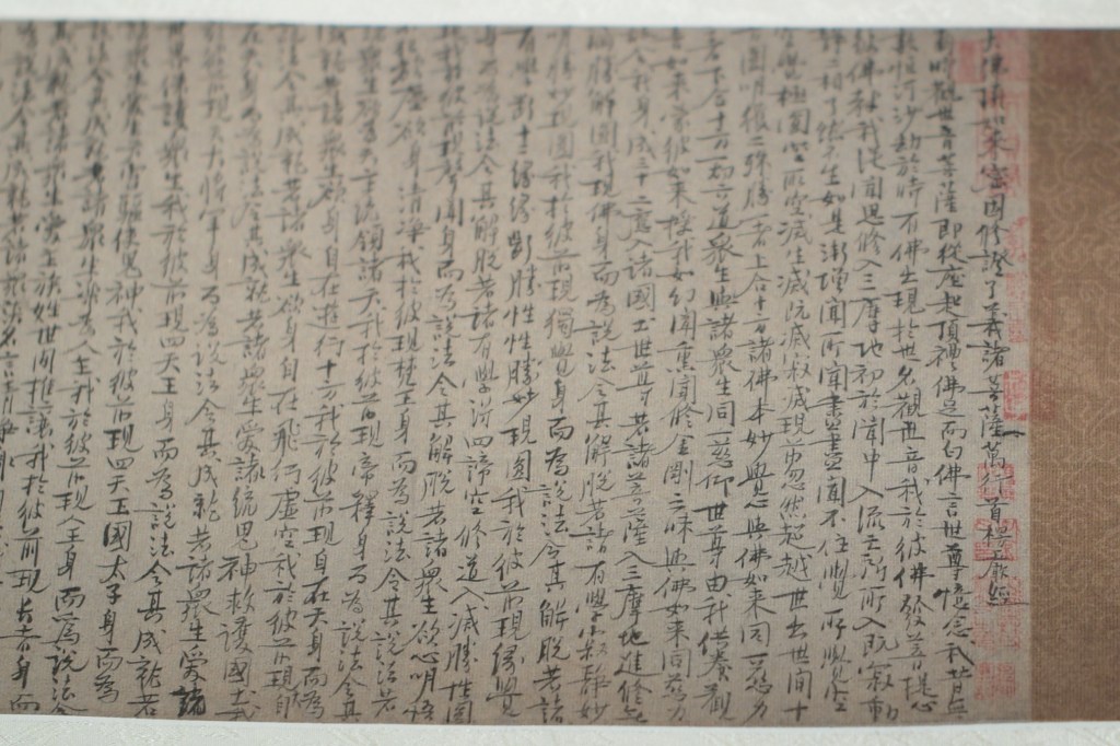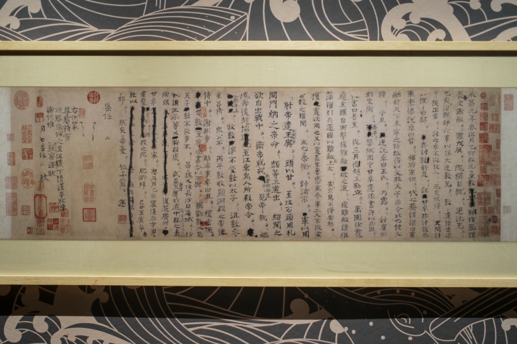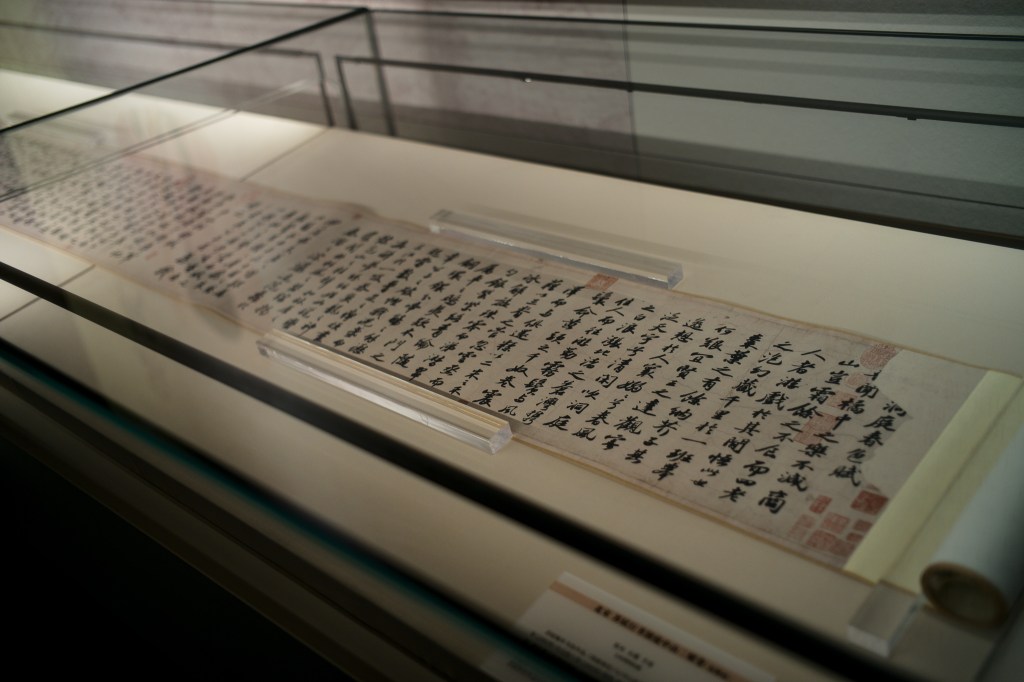 此次展出最吸引人的是苏轼的《中山送醪赋》真品(可惜同卷的《洞庭春色赋》未铺展开)。此卷作于元佑七年。时宣仁(高太后)去世,元佑更化嘎止。苏轼自度不利,便请出知定州,求仁得仁。一路上苏轼心情压抑,自谓“白首无归期”(一言成谶),在渡过漳水时作此赋。由此说来到倒也和王荆公隐隐相关。