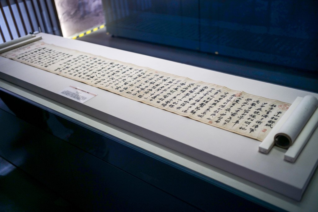 展品中分量第二重的,是明人临摹的王荆公遗像及朝廷追封太傅制文。荆公逝于元佑元年,正直新法尽废,旧党重起之时。制书便是出于中书舍人苏轼手笔。细品文字,所谓“少学孔孟,晚师瞿聃”,似离经叛道之指;“断以己意”,隐约见“拗相公”之影射;“糠秕百家之陈迹,作新斯人”,应合《三经义》取仕之举;而“方需功业之成,遽起山林之兴”,难免没有对其黯然罢相知嘲讽。世人多乐信苏轼“从公已觉十年迟”,钟与荆公和解,可惜并非事实。除此制文疑似映射以外(苏轼后因“掌管制命语涉讥汕”而遭弹劾。谈及此处,对苏轼为人处事略有感怀,附于后文),另有奏章铁证:“窃以为安石平生所谓,是非邪正,中外具知,难逃圣鉴…惜王安石在仁宗、英宗朝,狡诈百端,妄窃大名,或以为可用,惟韩琦独识其奸…“。“吕惠卿、李定、蔡确…其为奸恶,未能息数,而王安石实为之首…此等皆民之大贼,国之巨蠹…”(余实以为,苏轼对于荆公,章惇等人,并无切实爱憎,之是凭拿来注意,纵横捭阖说事罢了。由此看来,苏轼效仿战国纵横家之术,不虚也)。