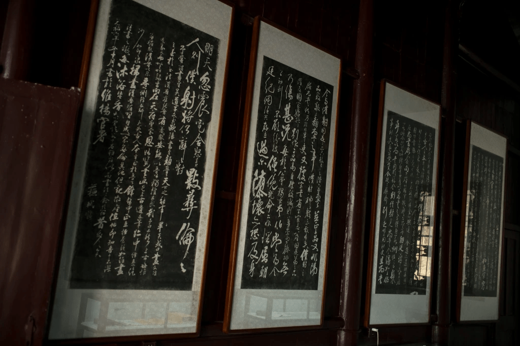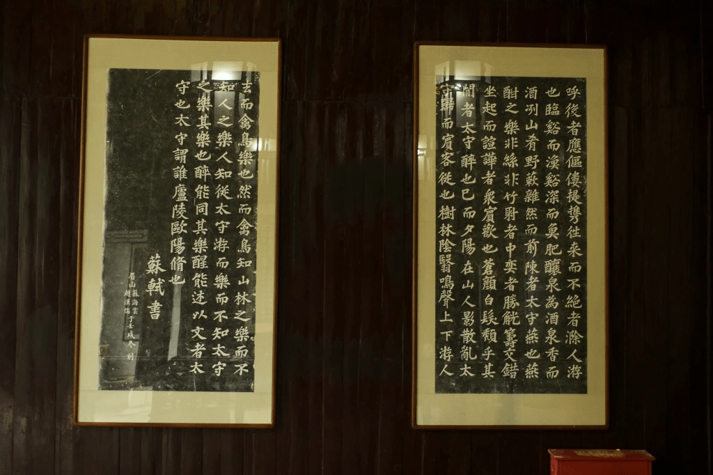 谒史公毕,转去平山堂凭吊欧阳修、苏东坡二贤人。贤人,同时也是闲人。两人先后谪贬至此。文翁来到蜀山,爱此处“与远山平”,遂建一堂。而后东坡趋至,于其后另建一堂。两堂屡毁屡建(堂前垂柳虽号太守手种,亦定是重植),仍不妨吾曹追攀古人之心。更何况此处清净,正宜静坐片刻,遐想古人风采。堂壁更有苏轼《醉翁亭记》、《临争座位稿》拓印,可谓意外惊喜。