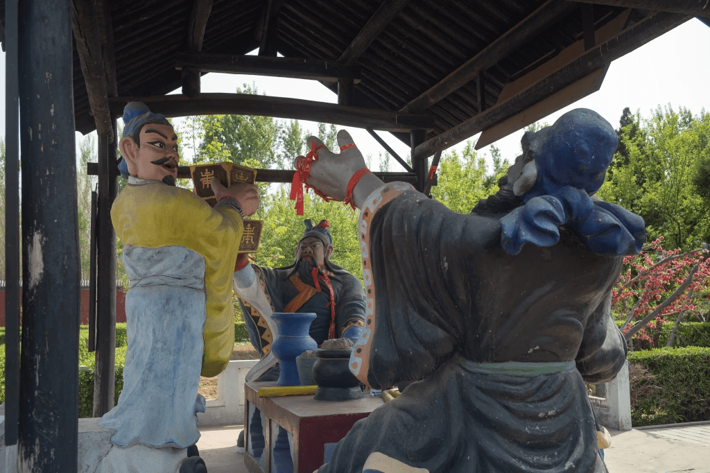 其中张飞居住的地方据传在汉代桃店,桃园结义的传说大概源出于此。后院的桃园三结义塑像,则直接略过“焚香再拜”仪式,只采“宰牛设酒”的场景了。另据三国志记载,张飞兄事关羽,并侍刘备。如此说来小说中的结义也有一定的依据,近似三分之二属实吧。