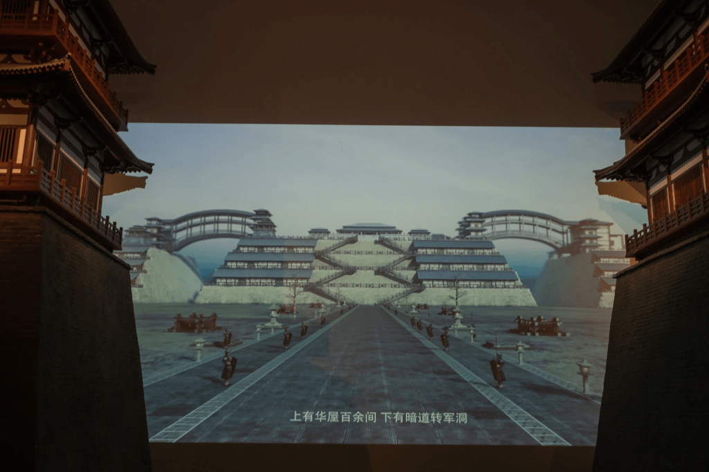 尔乃都城万雉,百里周回。九衢交错,三门旁开。层楼疏阁,连栋结阶。峙华爵以表甍,若翔凤之将飞。正殿俨其造天,朱棂赫以舒光。盘虬螭之蜿蜒,承雄虹之飞梁。结云阁于南宇,立丛台于少阳。