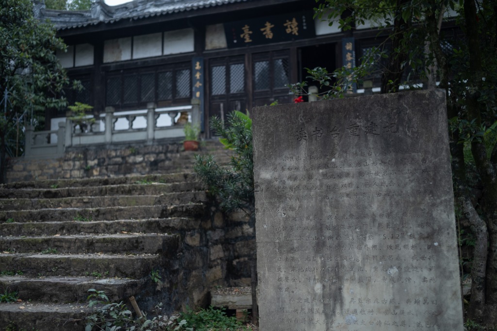 据传匡山有大小二处,读书台所在为小匡山。太白青年时从赵蕤习经济之学。如今山下村曰读书村,沿村中小路抵山脚下,可见读书台岿立于二十余丈山顶。不顾式微,毅然拾乱石阶而上,手足并至。登至山顶,恰闻远处“列缺霹雳”,真有云之仙人飘飘而来下之感。于戏,若能暂抛杂务、关闭手机,仅持一部太白全集,在读书台中居住旬日,岂不美哉!